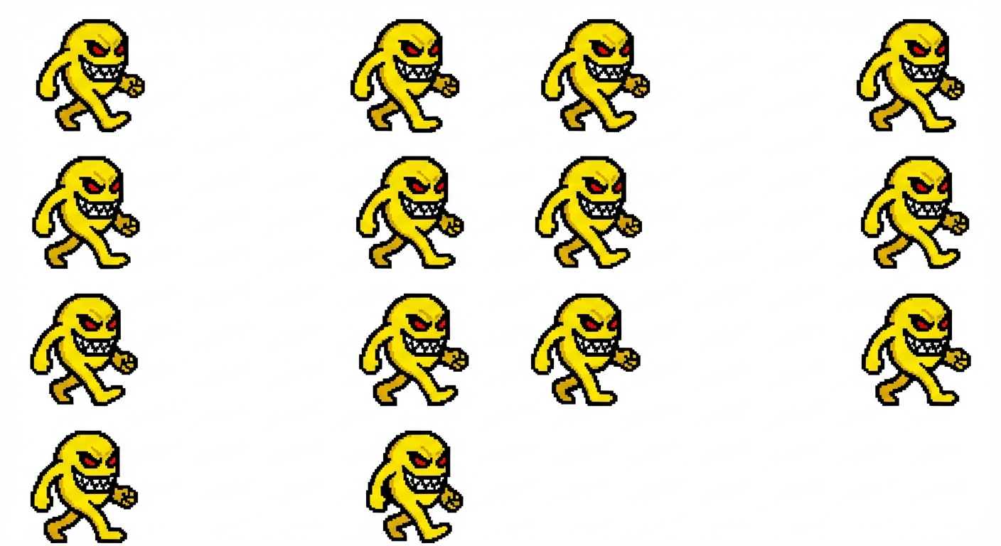 ""Create an evil yellow monster in pixel art, with sharp teeth, glowing red eyes, and a menacing expression. The creature should look aggressive and energetic. Generate a full walking animation with multiple frames, showing smooth leg and arm movement. Style: retro 16‑bit, high contrast, bold outlines.""