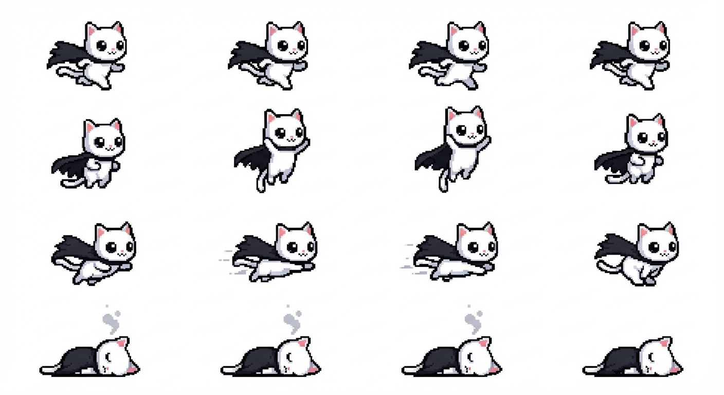 "A spritesheet of a cute white cat in a black shredded cape, running to the right he can jump and dash, should have a death animation"