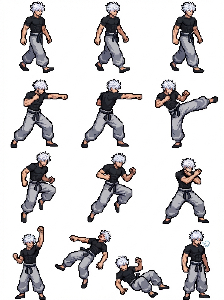 "maak mijn voorbeeld afbeelding zodat hij kan wandelen, vechten met handen en voeten, springen, aanvallen kan blokeren, een victory pose aanneemt en valt als hij uit de lucht word getrapt als laatst ook als hij stil staat dat hij er levendig uitziet, in Pixel Art style"