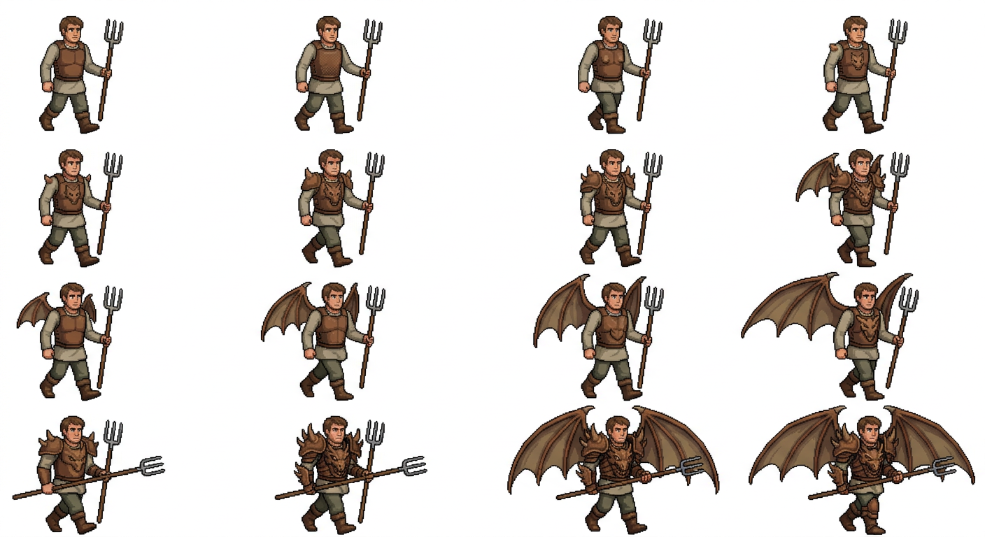 "a farmer walking. as he is walking he is wearing a chest piece armor.. but as he is walking the armor grows a dragon face on his chest.. then grows shoulders them grows wings"
