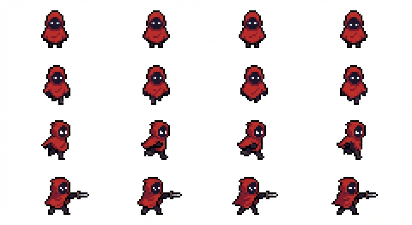 "Crie um personagem para um jogo top down com idle, walking, running e attack. O personagem precisa ter um capuz vermelho, o rosto é todo escuro/preto aparecendo apenas os olhos em branco. O capuz dele é proveniente de um poncho vermelho que vai até os pés, mas os pés ainda são visíveis., in Pixel Art style"