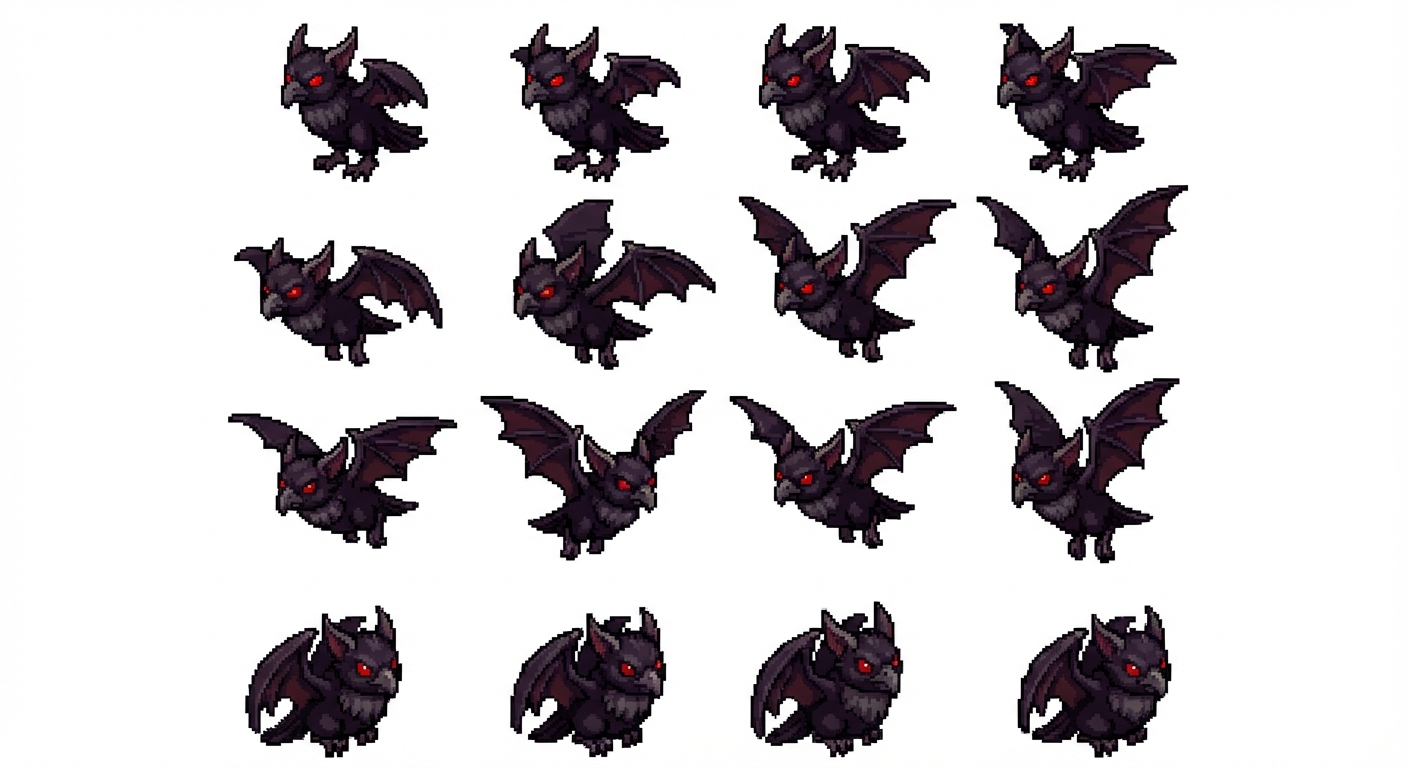 "Create a high-quality pixel art creature for a Tibia-style MMORPG. Subject: A fantasy bird / bat hybrid mount Style: Tibia 10.x–13.x style, top-down 45-degree perspective Resolution: 32x32 or 64x64 sprite Palette: Limited color palette, clean shading, high contrast Design: - Small compact body - Large stylized wings (clear silhouette) - Glowing eyes (red or green) - Slight fantasy elements (horns or spikes optional) - Dark fantasy theme Animation frames: - Idle (2–4 frames) - Flying animation (4–6 frames) Rendering: - Pixel perfect (no blur) - Clean outlines - Game-ready sprite sheet Background: transparent"