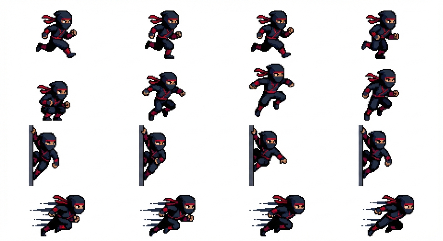 "16 by 16 ninja with a run jump wall jump and a dash, in Pixel Art style"