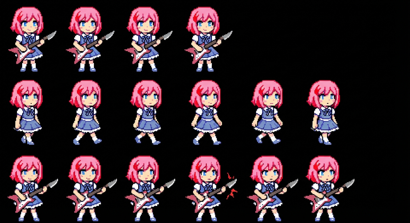 "akira with a knifelike guitar and she has pink hair with red highlights and blue eyes with cutesy outfit undertale style artwork "