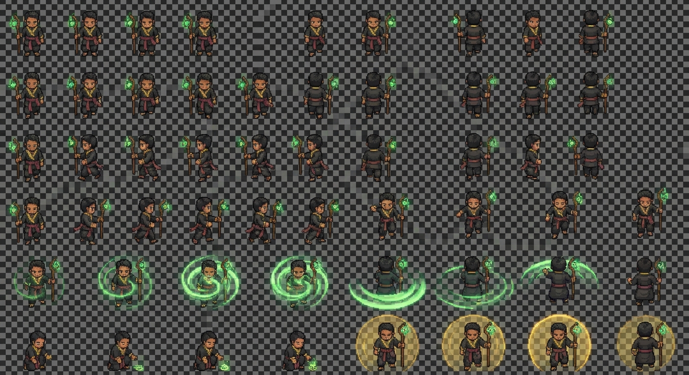 "2D top-down pixel art sprite sheet of a Filipino albularyo healer, traditional clothing with gold and muted red accents, carrying wooden staff with glowing charm, subtle green spiritual energy, survival horror tone. Include animation frames for: - Idle (staff glow pulsing softly) - Walking (8 frames per direction, sash and charm movement) - Jumping (light grounded hop) - Healing allies (green aura spiral effect) - Remove curse (cleansing wave animation) - Place protective charm (placing talisman on ground, small glowing circle) - Buff teammates (golden aura expanding outward) Ensure smooth transitions between frames, consistent sprite scale, subtle breathing animation even in idle, 48x48 pixel grid, transparent background."