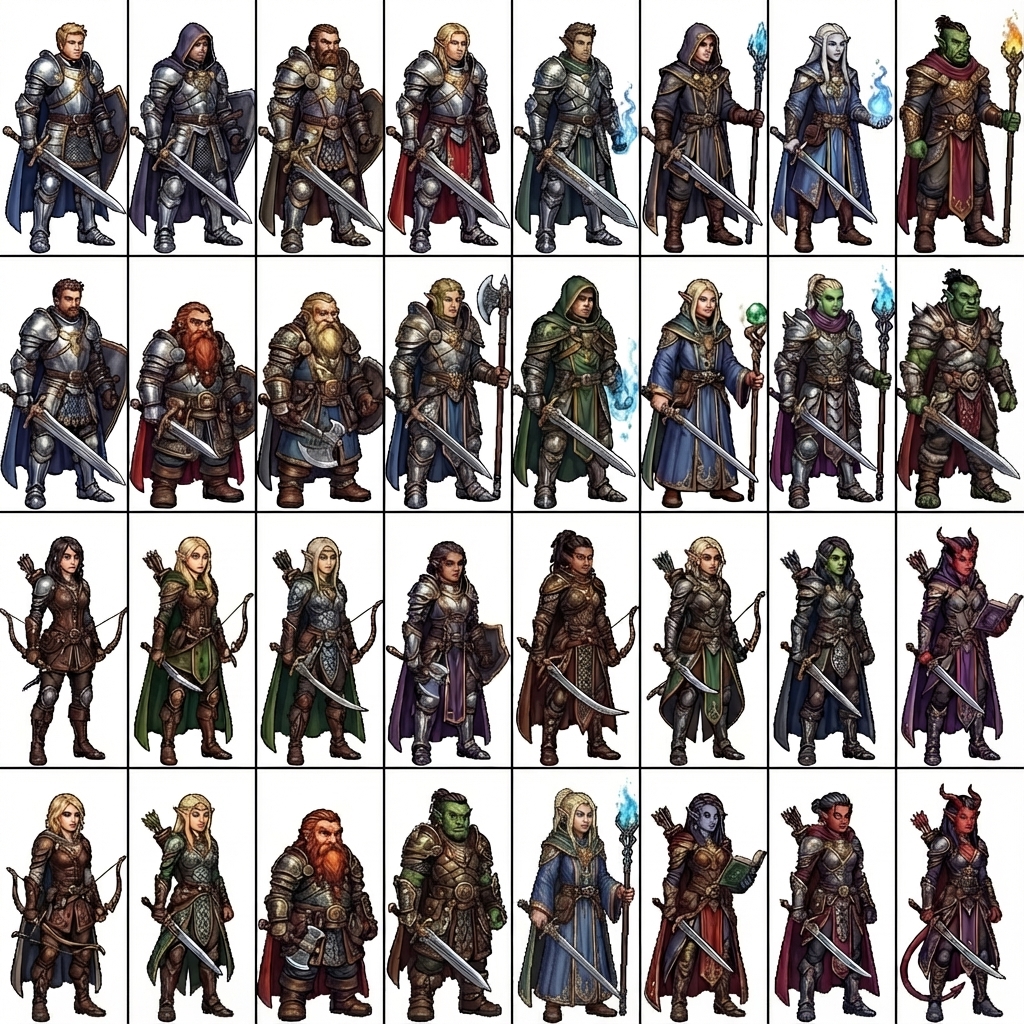 "I need a 1024x1024 sprite sheet that consists of 32 frames, 8 columns and 4 rows of 128w x 256h sprites. These are to be Hi-res pixel art fantasy characters with high level gear on, full view and characters should be facing to the right. We want lots of diversity and flavor. 16 males and 16 females to keep it even."
