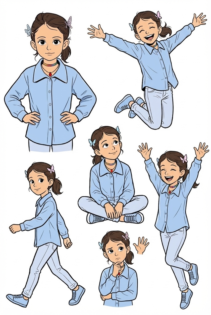 "Sprite sheet of a cheerful elementary-school girl character with light tan skin, large dark eyes, and medium brown hair in a low side ponytail with two butterfly hair clips (one light blue, one pink). She wears an oversized light blue button-up shirt with a large collar, slim pants, sneakers, a rainbow bead choker, and a small red pendant necklace. Layout: animation sprite sheet with multiple poses arranged in a grid. Poses: standing neutral, walking left, walking right, jumping, sitting cross-legged, waving, thinking, excited jump. Style: clean children’s book illustration, smooth line art, soft pastel colors, consistent proportions. White background, evenly spaced frames, full body visible in each frame, character centered in each cell., in Flat / Minimalist Art style"