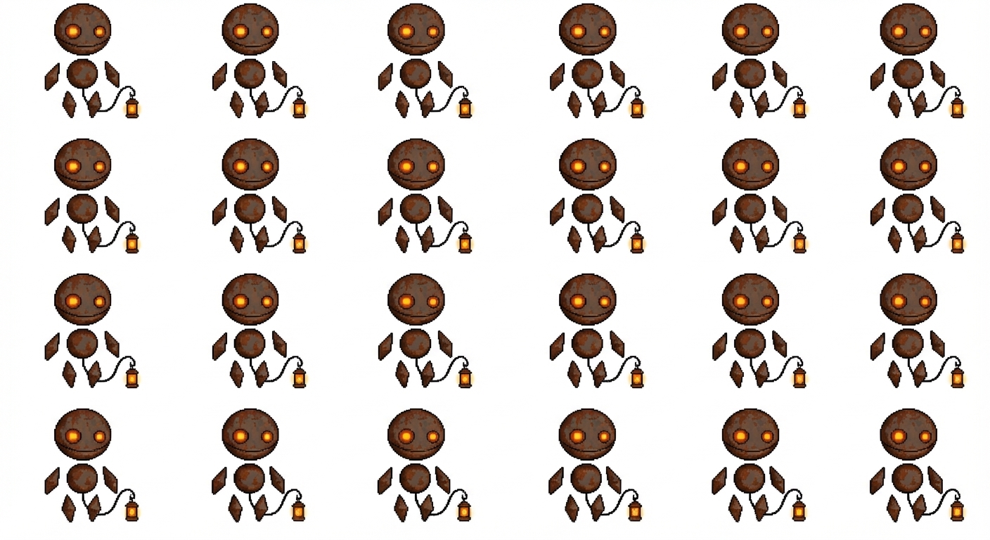 "A rusty robot with a large circle head, smaller circle body, and rhombus arms and legs, all detached and floating, give him a really thin wire tail holding a lantern and make it in 32x32 pixels"