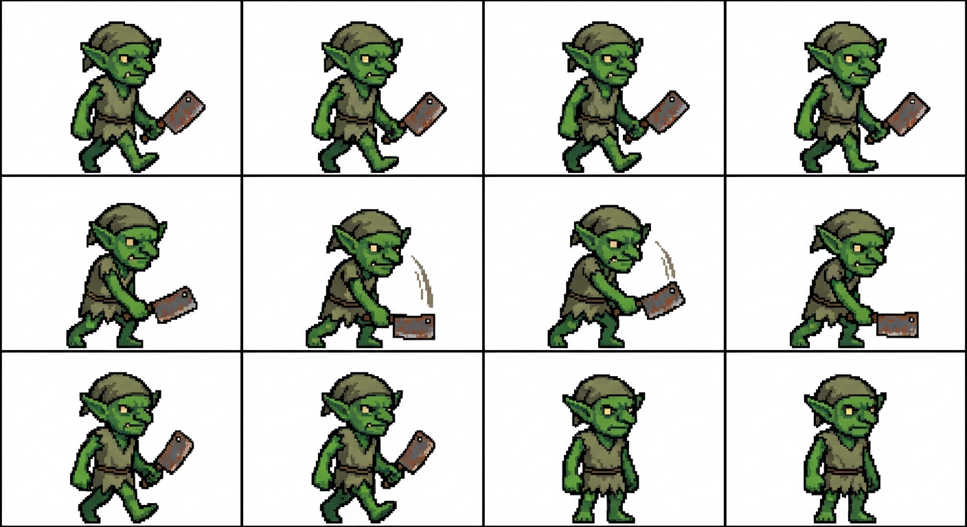 "A goblin with a clave in the right hand, with 5 or 6 frames for walking and 5 frames for attack., in Pixel Art style"