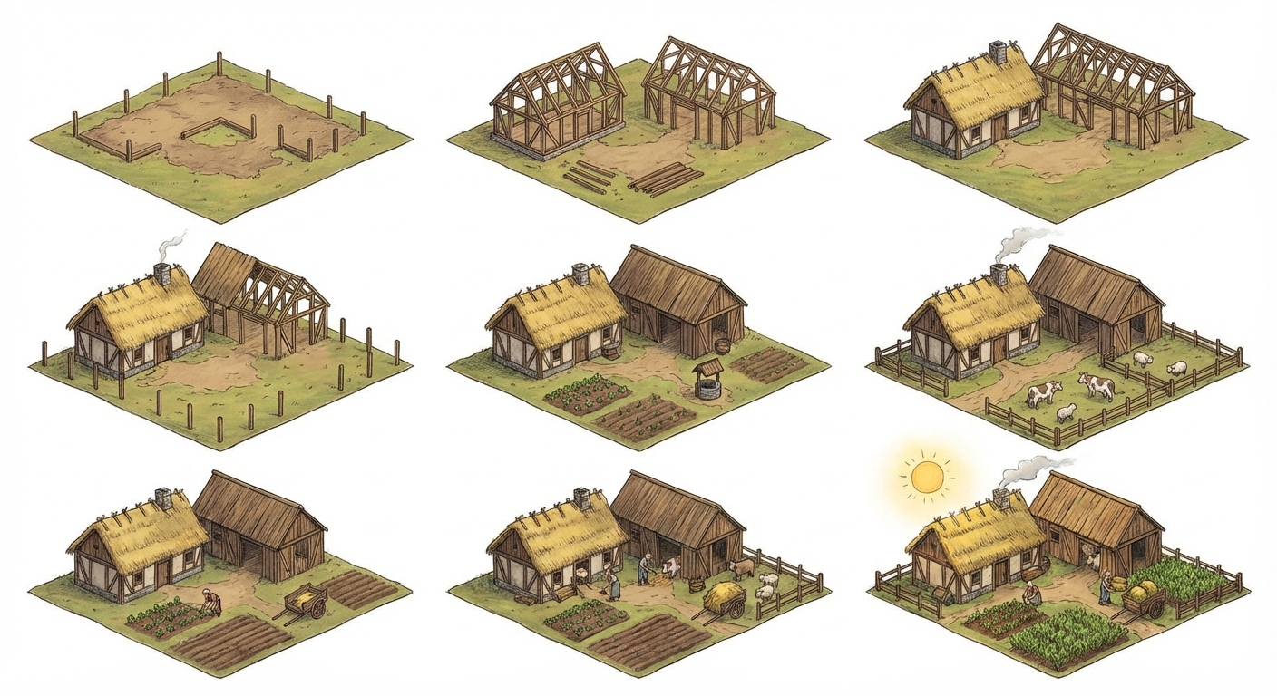 "A detailed 2/3 top-down isometric view of a medieval Scandinavian farm, semi-realistic style, vibrant colors, lush greenery. Central wooden farmhouse with a thatched roof and smoke from the chimney, surrounded by plowed fields of wheat, barley, and vegetables. A small barn with cows and sheep in a fenced pen, a well with a bucket, and dirt paths connecting buildings. Two workers tending crops and feeding animals, with a wooden cart loaded with hay. Inspired by Banished and Northgard. The image should represent the buildings construction progression from just the base to completed building. , in Hand-Drawn Art style"