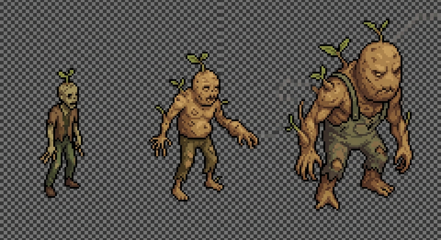 "Pixel art isometric 2D game asset sprite sheet showing the full evolution stages of a single zombie type: [patatoe]. The image contains EXACTLY 3 evolution stages of the SAME zombie, arranged horizontally from left to right, evenly spaced and aligned for slicing. Stage 1 – Newly emerged zombie - minimal mutation - small, simple pixel silhouette - early signs of infection related to the seed type Stage 2 – Evolved zombie - larger body - clearer mutations - stronger and more dangerous look Stage 3 – Fully mutated zombie - biggest and most intimidating version - exaggerated mutations - clearly the strongest form Pixel art rules: - clean, sharp pixel edges - NO anti-aliasing - NO gradients, use flat colors - limited color palette - consistent lighting across all stages - same camera angle and proportions for all stages Camera & layout: - isometric top-down view (classic game isometric) - identical alignment and scale for each stage - centered characters - equal spacing between stages Technical requirements: - static pose only - NO animation frames - NO background - NO ground or soil - NO shadows - transparent background - sprite-sheet friendly - suitable for slicing and direct in-game use Style reference: - cozy yet slightly creepy farming game - readable at small sprite sizes - inspired by classic pixel farm and isometric games pixel art isometric zombie evolution sprite sheet, game-ready asset , in Pixel Art style"