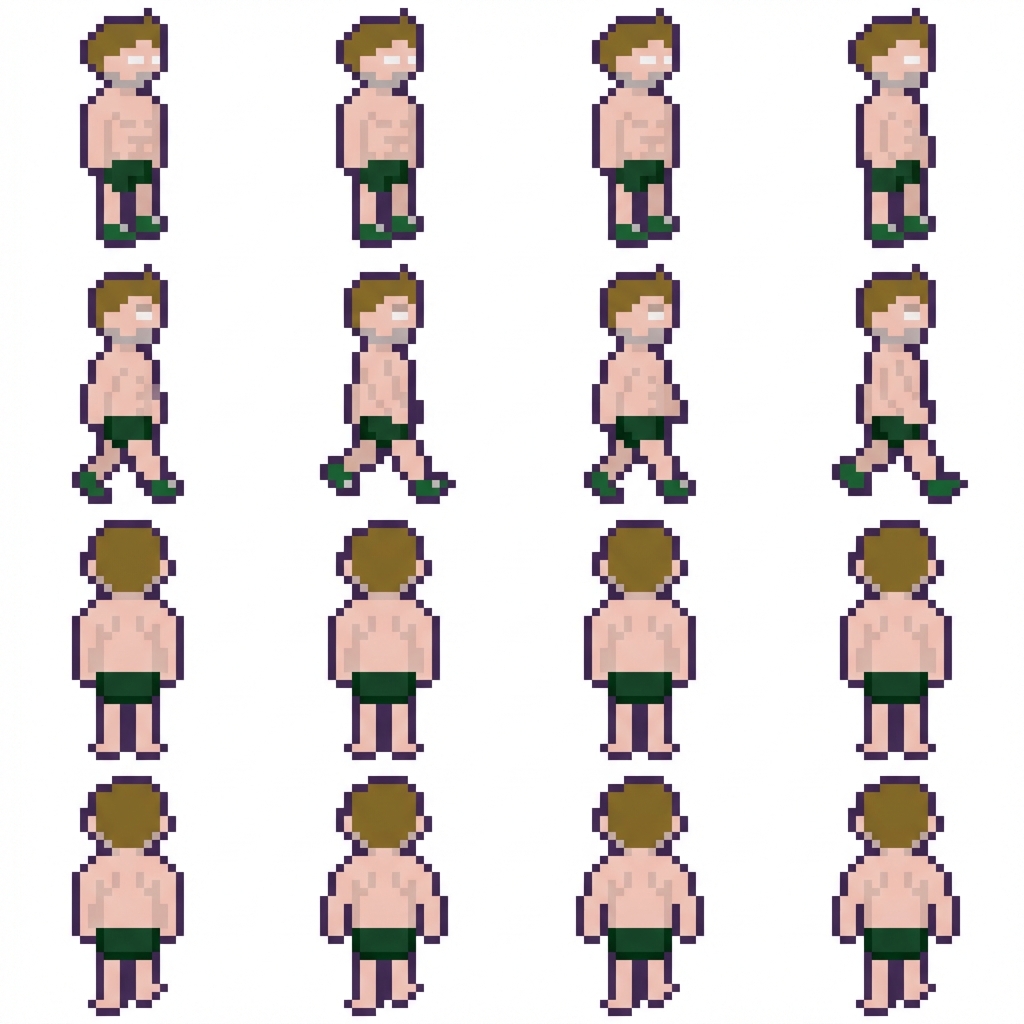 "give me a sprite like this with all animations in 64x64 face left face up, walk animations "