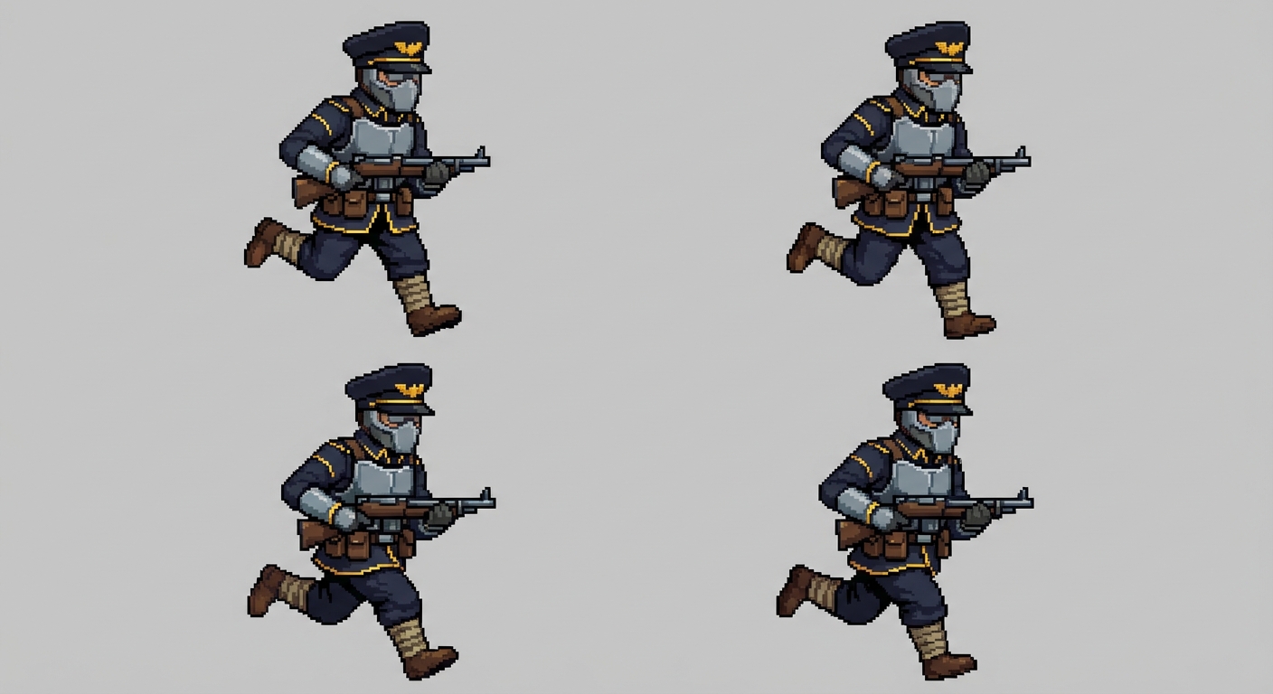 "Create a 2×2 sprite sheet (4 frames) of a heavily armored masked soldier running. The character wears a dark navy military uniform with gold trims, a reinforced chest plate, padded arm guards, utility pouches, a tall officer hat with an emblem, and a metal face mask covering the upper half of the face. Leather boots are wrapped with cloth strips around the shins. He holds an old-style rifle close to his body while running. Each frame should show a different stage of the running cycle with consistent proportions, same angle, and one frame per cell, arranged in a 2×2 grid. at 1K resolution"