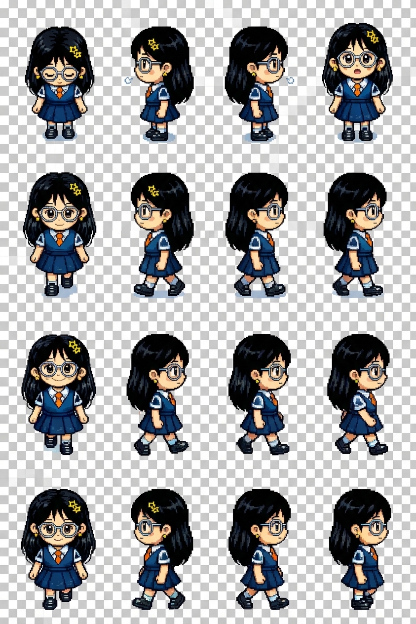 "top-down pixel art character, Pokémon style, idle animation frames, walking animation frames, sprite sheet, 8-direction movement, clean pixels, game asset, transparent background, in Pixel Art style"