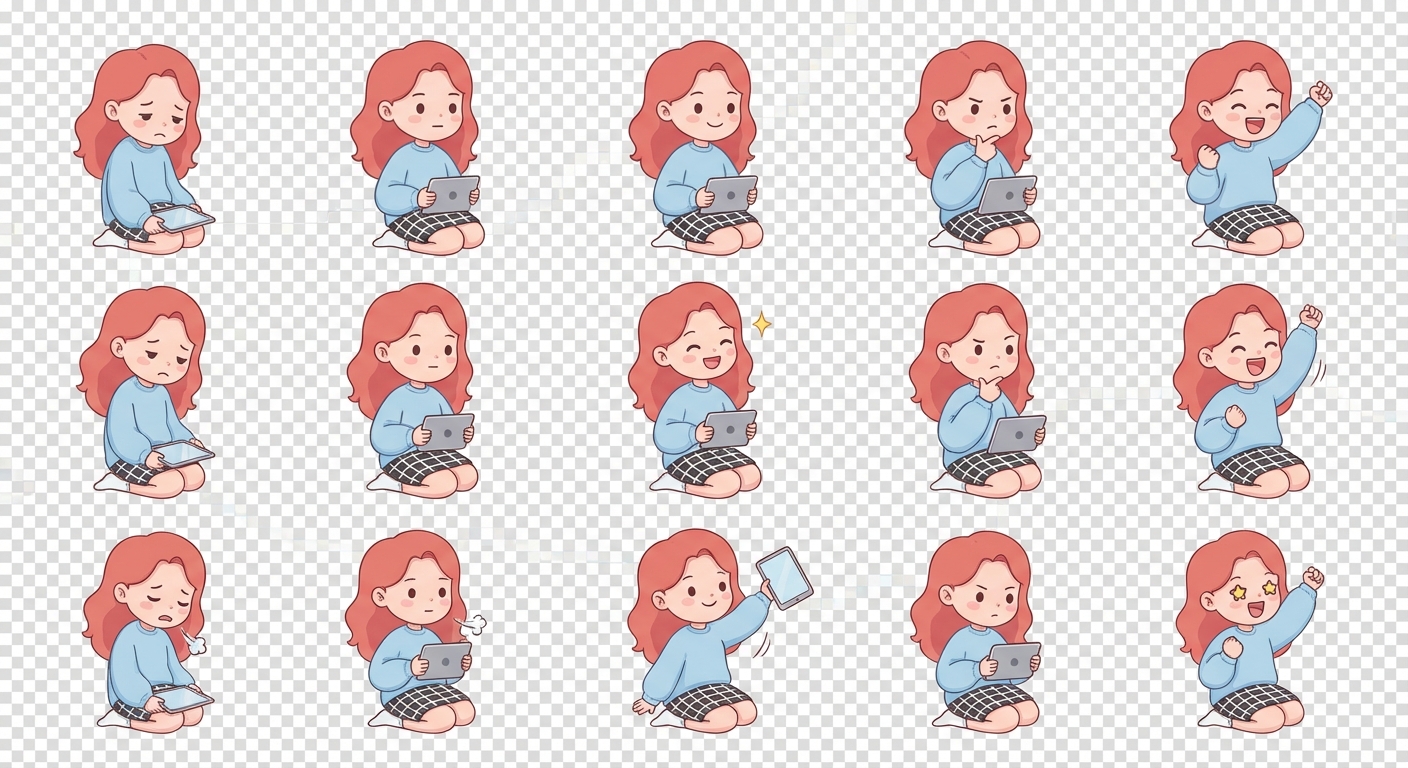 "A cute 2D chibi-style girl character with soft red wavy hair, wearing a light blue oversized sweater and a black-and-white checkered skirt, sitting on the floor holding a tablet. Create a sprite sheet arranged in 5 columns and multiple rows. Each column represents one emotion with smooth animation frames from top to bottom: sad and tired calm/neutral happy and inspired focused and thinking excited and celebrating Keep the face shape, eyes, hairstyle, clothes, and proportions perfectly consistent across all frames. Only small changes in facial expression and body movement for animation. Clean transparent background, soft pastel colors, modern cute illustration style, game-ready sprite sheet, evenly spaced frames. flat 2D cartoon style, soft outlines, high consistency character model, no distortion, no extra characters, smooth animation transitions"