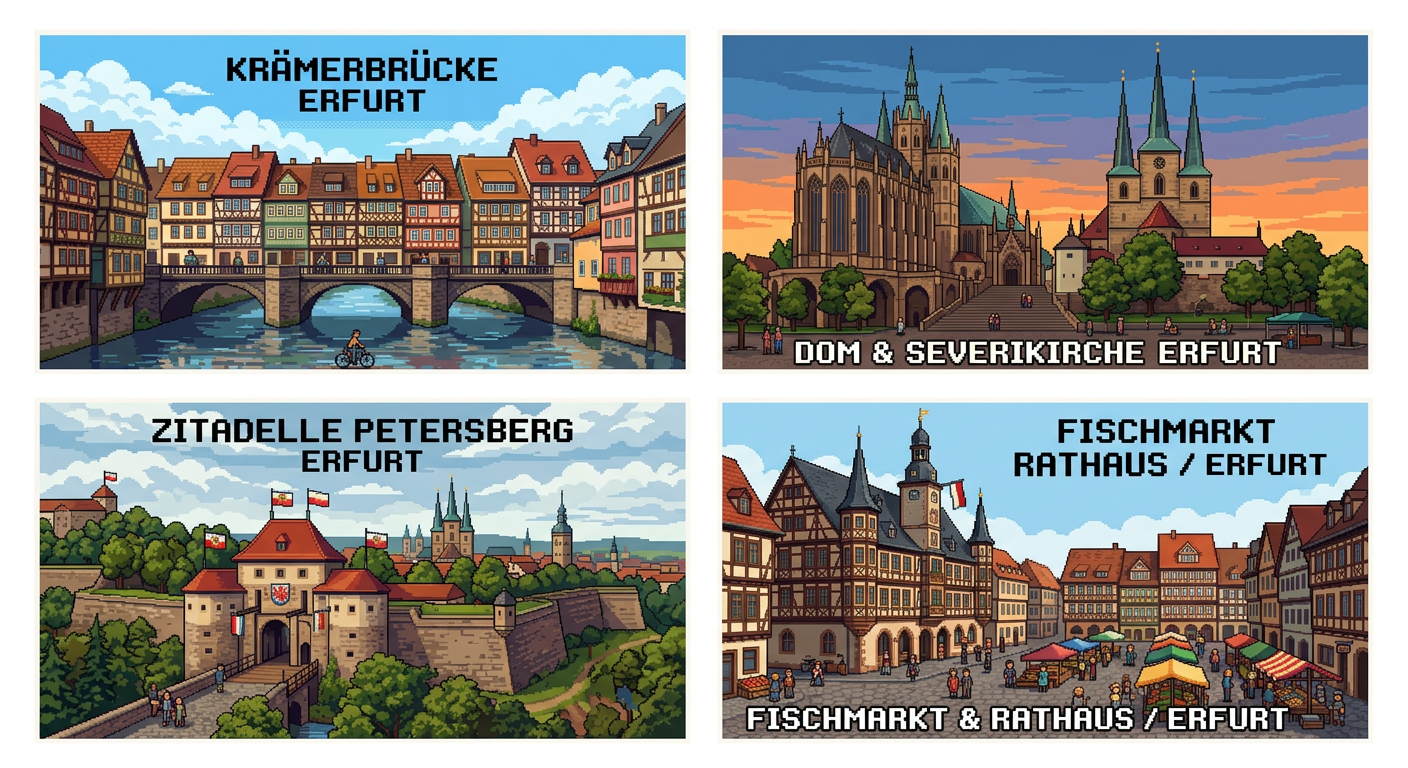 "Make some different pixelart images from Erfurt (Thuringia), like different postcards"