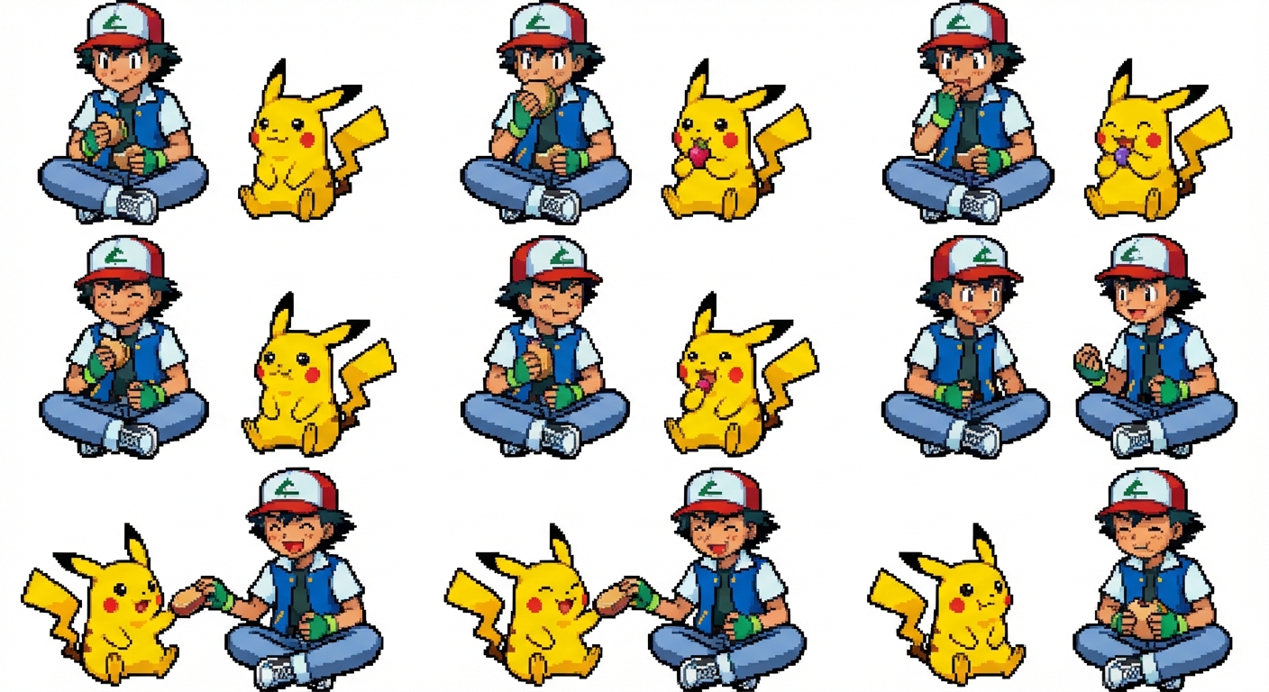 "Make an Pokémon sprite of Pikachu eating with Ash Ketchum"