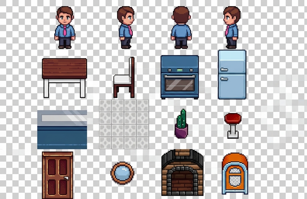 "Can you generate a simple sprite sheet for a restaurant game? Each tile will be 32x32 pixels. Please generate sprites that would be used for a restaurant, include tables, chairs, an oven, fridge. Also generate a character sprite as a placeholder for my game dev learning. Use a transparent background."