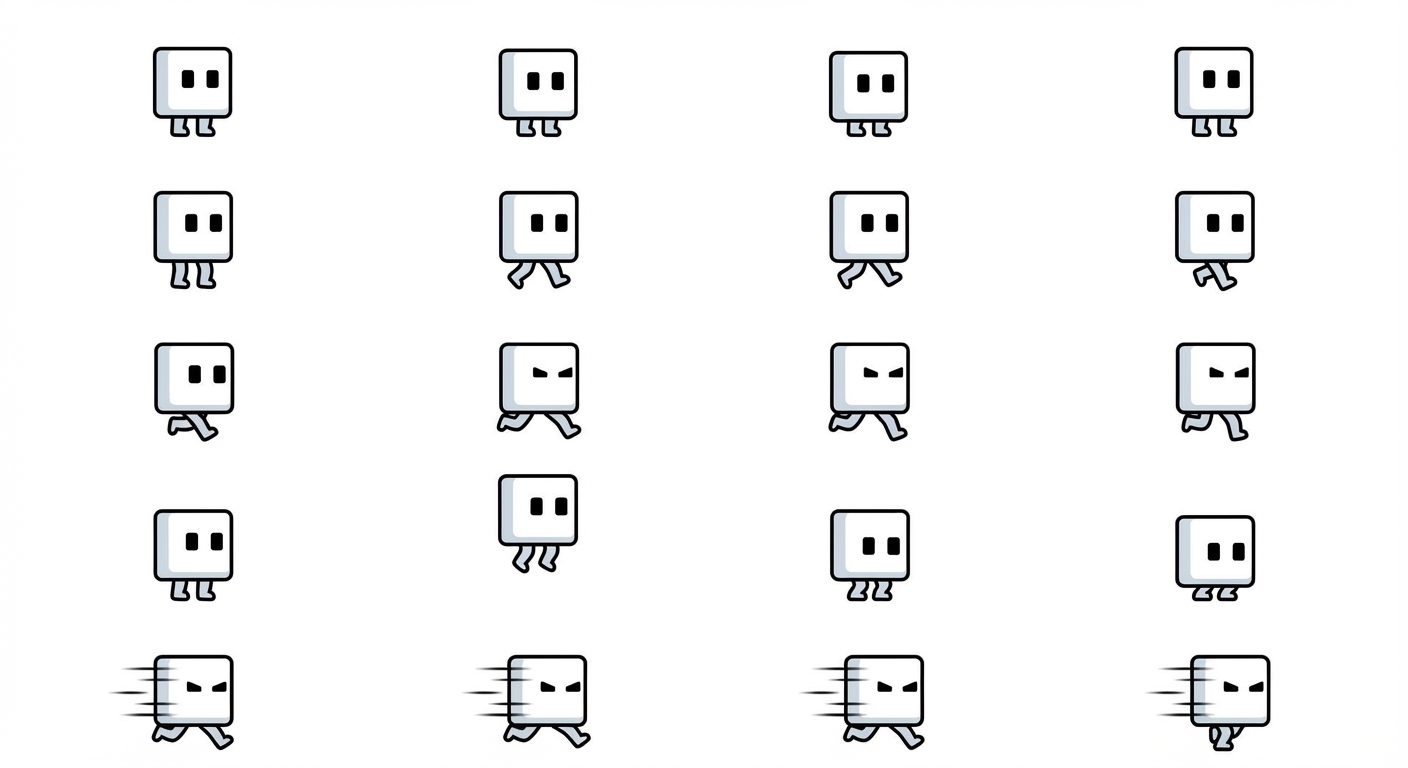 "white square character with short legs and black rectangular eyes. Make idle, walk, run, jump and dash animations in 4 frames each"