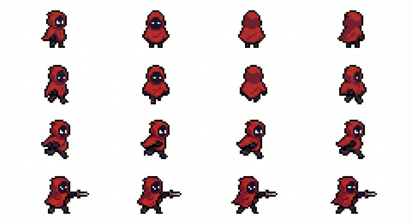 "Quase isso. Faltou fazer o idle direita, idle down, idle up. também walking direita, down e up, attacking direita, down e up, running direita, down e up, in Pixel Art style"