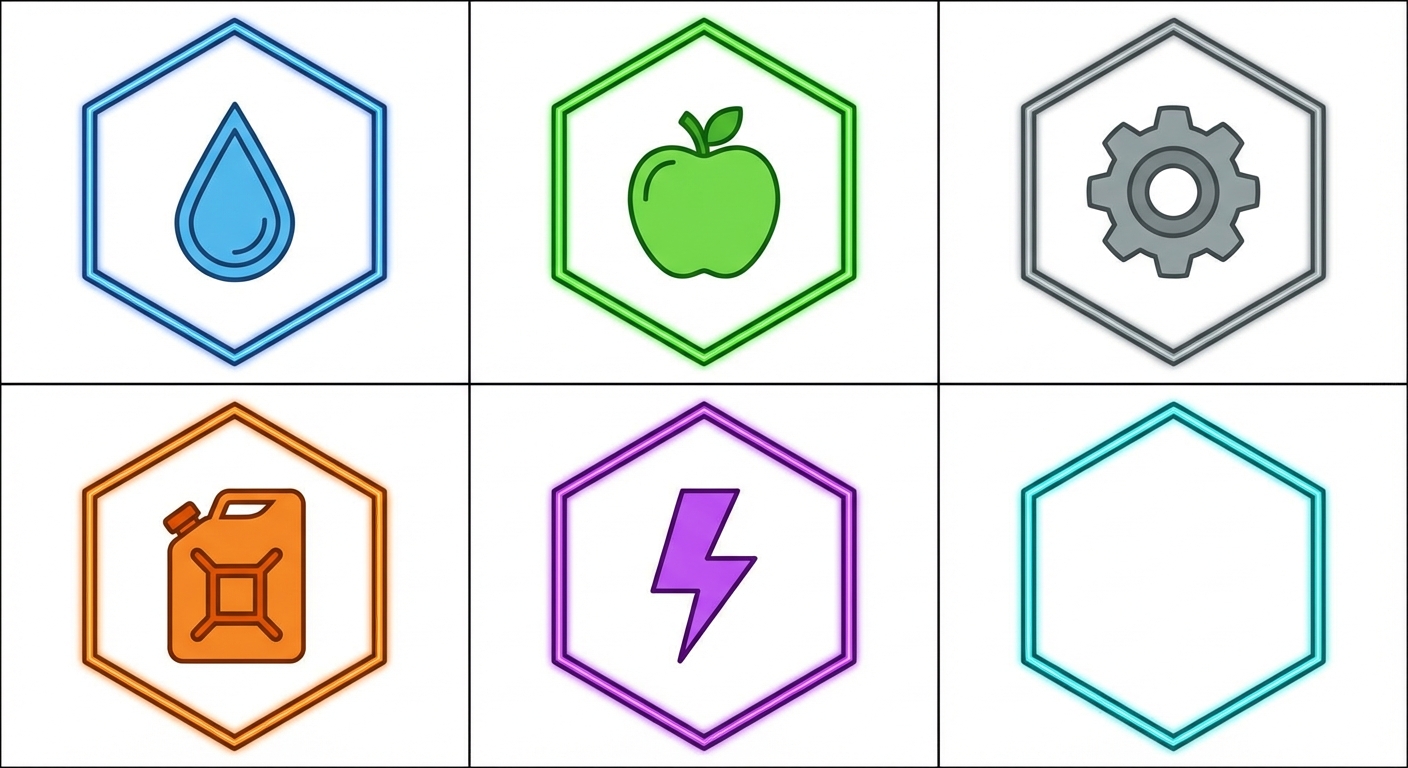 "2d Sprite sheet consisting of Hexagon Sprites with thin Neon borders, Resource Icons in the middle of the sprite for Water, Food, Metal, Fuel, and Energy. Also a blank hexagon with a thin neon border, in Vector Art style"