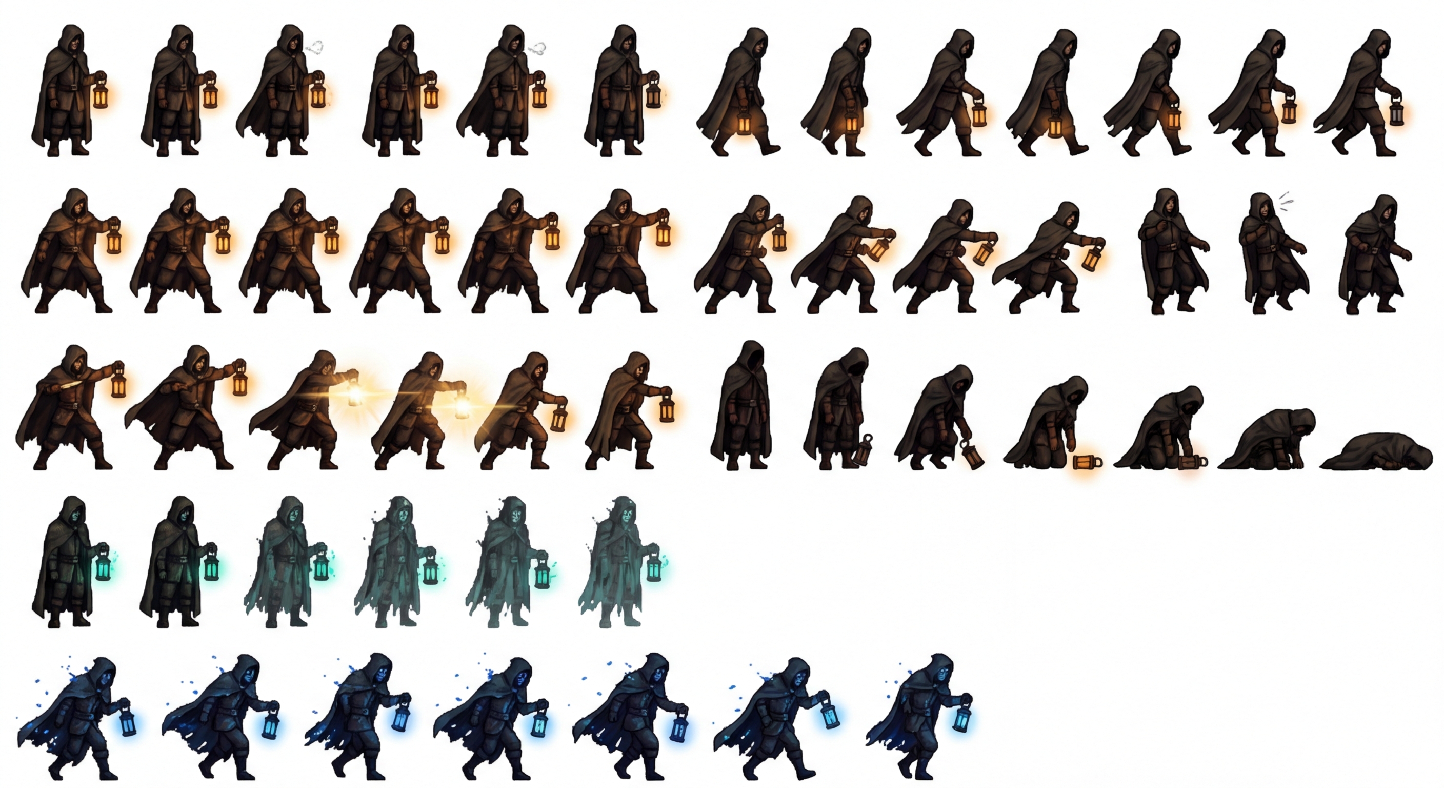 "đĽ RowâbyâRow Breakdown 1. Idle (Exploration) â 6 Frames Aren stands with the weight of his past visible in microâmotion. Cloak panels sway independently with a slow, heavy rhythm. Lantern flickers softly, casting a warm cone of light. Shoulders subtly rise and fall with breathing. Hair shifts 1â2 pixels every few frames. Timing: 180â220 ms per frame for a calm, atmospheric feel. 2. Walk Cycle â 8 Frames A grounded, deliberate stride that communicates burden and purpose. Steps are heavy, with slight dust or ember flicks. Cloak trails behind with a 2âframe delay. Lantern swings in a gentle arc, light shifting across his body. Torso leans slightly forward. Timing: 100â120 ms per frame for smooth motion. 3. Combat Idle â 6 Frames Aren becomes sharper, more alert, silhouette widening. Lantern raised slightly, light becomes more directional. Eyes brighten 1â2 pixels. Cloak spreads subtly, giving a more aggressive outline. Breathing becomes tighter and faster. Timing: 140â160 ms per frame. 4. Light Attack â 4 Frames Fast, decisive, readable even at small scale. Frame 1: Windâup, right arm pulled back. Frame 2: Strike begins, cloak snaps outward. Frame 3: Full extension with afterâimage streak. Frame 4: Recovery, lantern swings wide. Timing: Frames 1â2: 80 ms Frame 3: 60 ms Frame 4: 100 ms 5. Heavy Attack â 6 Frames More dramatic, with emotional weight. Frames 1â2: Slow, tense windâup; eyes flare. Frame 3: Lantern flicker intensifies. Frame 4: Massive swing or thrust with cloak tearing motion. Frames 5â6: Heavy recovery, body dips from exertion. Timing: Windâup: 120â150 ms Impact: 60â80 ms Recovery: 120 ms 6. Hurt / Stagger â 3 Frames Short, sharp, readable. Frame 1: Hit impact, torso recoils. Frame 2: Lantern swings violently. Frame 3: Partial recovery, still offâbalance. Timing: 80â100 ms per frame. 7. Death â 8 Frames A slow, tragic collapse that reinforces the gameâs emotional tone. Frame 1: Hit or exhaustion moment. Frame 2: Lantern slips from hand. Frame 3: Lantern hits ground, light flickers. Frame 4: Light extinguishes. Frames 5â8: Aren collapses to knees â falls forward â cloak settles. Timing: Frames 1â3: 100 ms Frame 4: 150 ms Frames 5â8: 120â150 ms 8. Corruption Idle Variant â 6 Frames Arenâs silhouette becomes unstable and eerie. Lantern flickers violently, shifting toward cold blue/green. Cloak edges animate with ghostâlike tearing. Eyes glow brighter, almost unnatural. Subtle sparks drift upward. Timing: 160â200 ms. 9. Corruption Walk Variant â 8 Frames Movement becomes more chaotic. Steps leave faint ember trails. Lantern swings erratically. Cloak motion becomes jittery, as if pulled by unseen forces. Slight distortion around silhouette (1â2 pixel jitter). Timing: 100â120 ms. đ¨ Color & Shading Notes Palette: charcoal, emberâred, muted violets, warm lantern yellows shifting to cold corruption blues. Shading: soft painterly gradients, but with gritty texture on cloak and boots. Lighting: lantern is the primary light source; always shade Aren with that in mind.đ Core Silhouette and Readability Arenâs sprite must communicate burden, resolve, and quiet menace even at small scale. His outline should be identifiable in a single glance. Tall, narrow silhouette with a slight forward lean, as if pulled by the lanternâs weight and his own history. Cloak split into two long, tapering panels, creating a trailing, emberâlike motion during movement. Lantern always the brightest element, hanging from his left hand, casting a soft cone of light that defines his silhouette. Right arm more angular and tense, ready for stanceâswitching combat. đĽ PixelâLevel Costume Breakdown Arenâs outfit should feel ancient, ritualistic, and wornânever generic fantasy. Cloak & Outer Garments Color palette: deep charcoal, muted emberâred accents, and faint violet undertones that appear only in shadow. Texture: slightly torn hem, frayed edges, and subtle vertical stitching that hints at old ceremonial garb. Movement: cloak panels sway independently; when he stops, they settle with a delayed, weighted motion. Inner Clothing Tunic: fitted, dark, with faint geometric patternsâglyphâlike but not readable. Sash/Belt: wrapped asymmetrically, holding small talismans that occasionally glint. Boots High, wrapped boots with layered cloth and leather. Footstep animation: slight dust or ember flicker on each step, depending on corruption level. đŻď¸ The Lantern (His Identity Anchor) This is the emotional and mechanical heart of Aren. Shape: a narrow, elongated lantern with ribbed metal and a cracked glass pane. Light: soft, warm core with a faint flicker; when corruption rises, the light becomes unstable, shifting toward cold blue or sickly green. Idle animation: the lantern sways gently, casting dynamic shadows on Arenâs cloak. đ Face & Head Details (PixelâReadable) Even at small scale, Arenâs face should carry tragedy. Eyes: dim, tired, with a faint ember glow that brightens during combat stance. Hair: mediumâlength, unkempt, swept slightly to one side; strands animate subtly in idle. Expression: neutral but heavyâbrows slightly angled inward, mouth a thin line. âď¸ CombatâReady Silhouette Arenâs sprite must shift clearly between exploration and combat. Exploration Stance Lantern held low. Shoulders slightly slumped. Cloak drapes more heavily. Combat Stance Lantern raised slightly, casting sharper shadows. Right arm angled outward, ready to strike. Cloak spreads subtly, widening his silhouette. đŤď¸ Corruption Meter Visual Effects Arenâs sprite should visually evolve with corruption. Low corruption: warm lantern glow, stable cloak motion. Mid corruption: faint ember sparks leak from his steps; cloak edges darken. High corruption: eyes brighten, lantern flickers violently, cloak tears animate with ghostly motion. đď¸ Animation Philosophy Your styleâmodern pixel art with emotional weightâthrives on microâanimations. Idle: cloak sway, lantern
