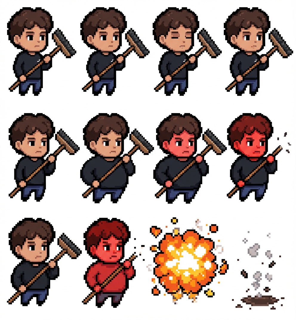 "mache von der person ein 2d pixel art. die beine sollen im verhältnis zum kopf relativ klein seien damit das pixelart niedlich aussieht. er braucht eine idle und eine explosion animation"