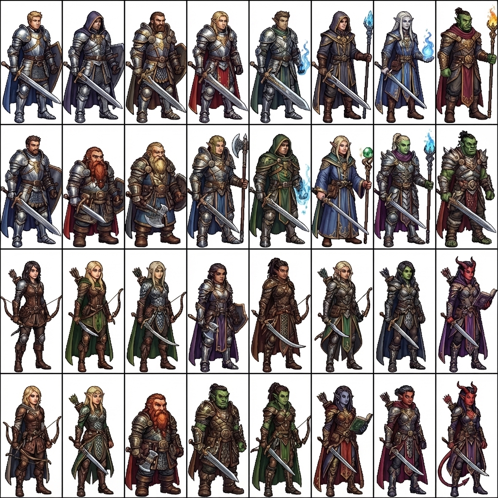 "I need a 1024x1024 sprite sheet that consists of 32 frames, 8 columns and 4 rows of 128w x 256h sprites. These are to be Hi-res pixel art fantasy characters with mid level gear on, full view and characters should be facing to the right. We want lots of diversity and flavor. 16 males and 16 females to keep it even."