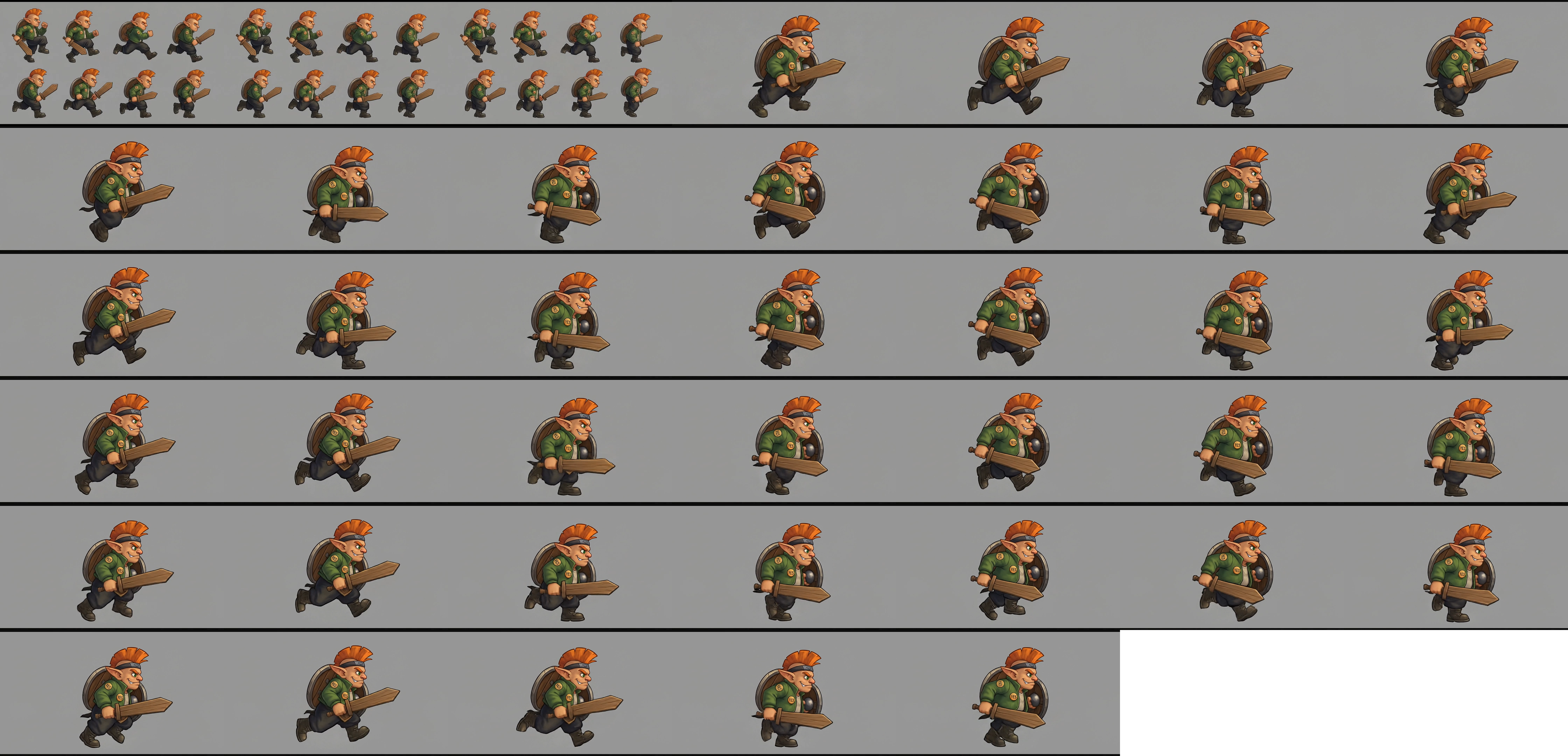 "Character Prompt Stylized cartoon RPG character, short and stocky goblin-like boy with oversized ears and a mischievous smirk, spiky orange mohawk hair held by a dark headband, expressive green eyes, wearing a slightly oversized green jacket with a round “YES” badge, dark loose pants, heavy boots, carrying a rough wooden shield on his back and holding a wide wooden plank sword, soft painterly shading, hand-painted fantasy game art style, exaggerated proportions, clean silhouette, neutral gray background, high detail, 2D character design for sprite sheet. Running Animation Prompt Side-view running animation sprite sheet, the character runs with a confident, bouncy stride, knees lifting high, feet stomping with weight, arms swinging asymmetrically due to the plank sword, wooden shield bouncing slightly on his back, head bobbing subtly with each step, jacket and pants flapping lightly, exaggerated squash-and-stretch motion"