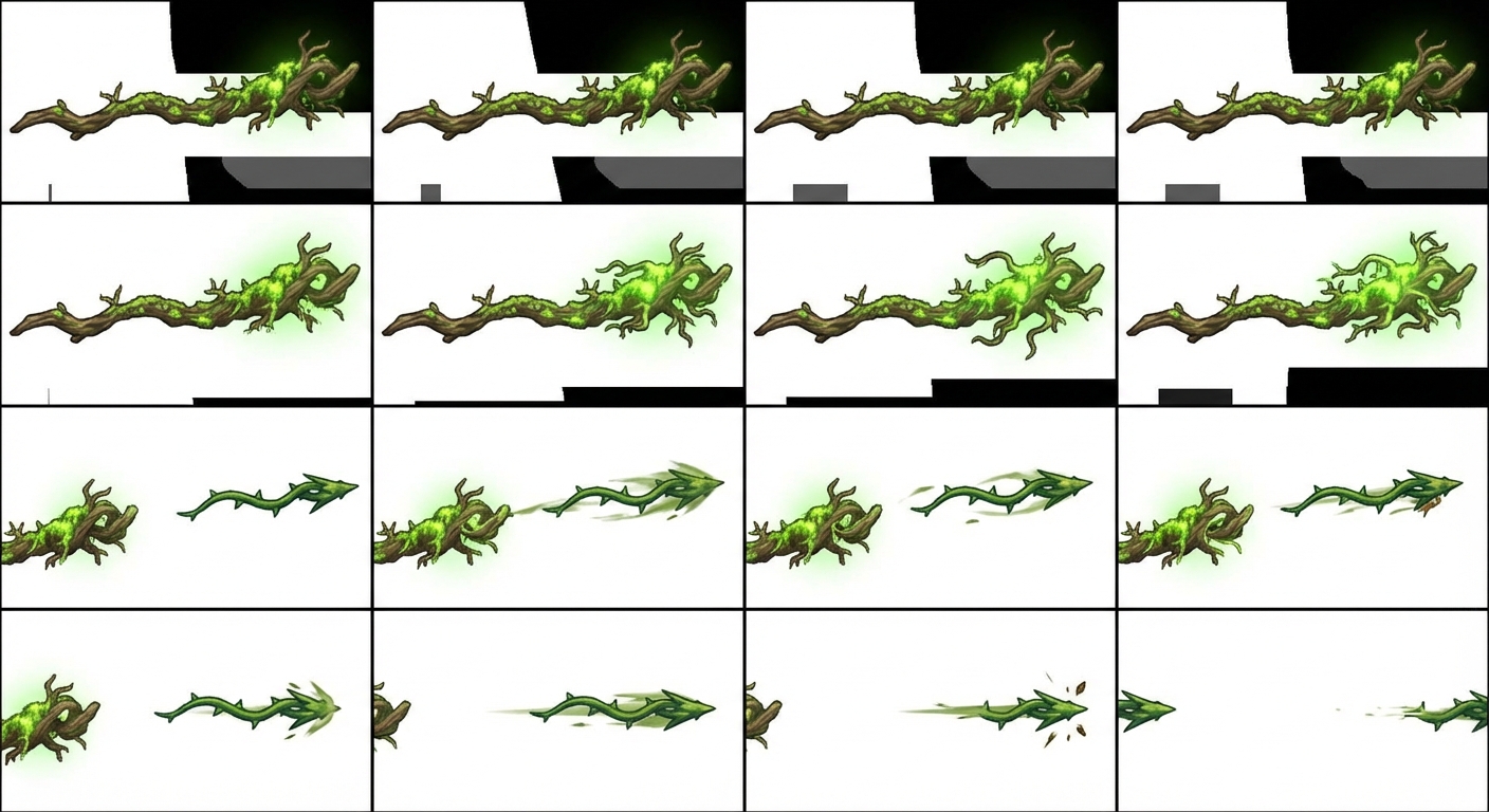 "The "Rootbound Staff" (Magic Weapon) Concept: A gnarled wooden staff, still partially alive, with glowing moss and small, tough roots intertwined around it. It feels ancient and connected to the natural world. Abilities: Fires a slow-moving, thorny vine projectile that can pierce one enemy and apply a "Thorned" debuff, causing minor damage over time."