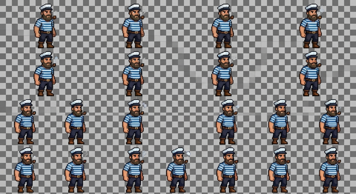 "pixel art sailor character, full body, front view, same character, consistent design, 64x64 sprite, retro game style, idle animation frames, subtle movement, transparent background, sprite sheet, evenly spaced frames, no variation in proportions Maybe the dude should look different"