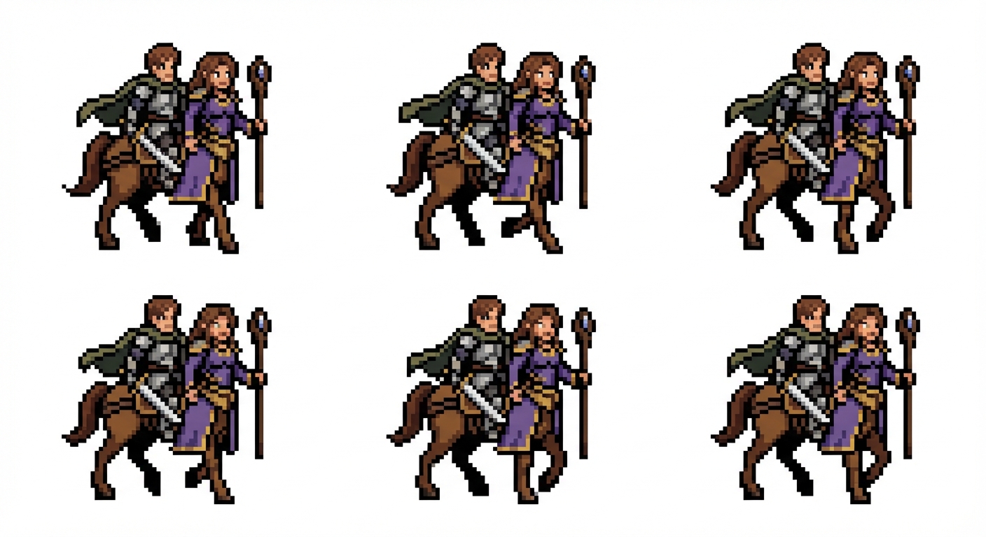 "A human fantasy adventurer riding on a female centaur adventurer., in Pixel Art style"