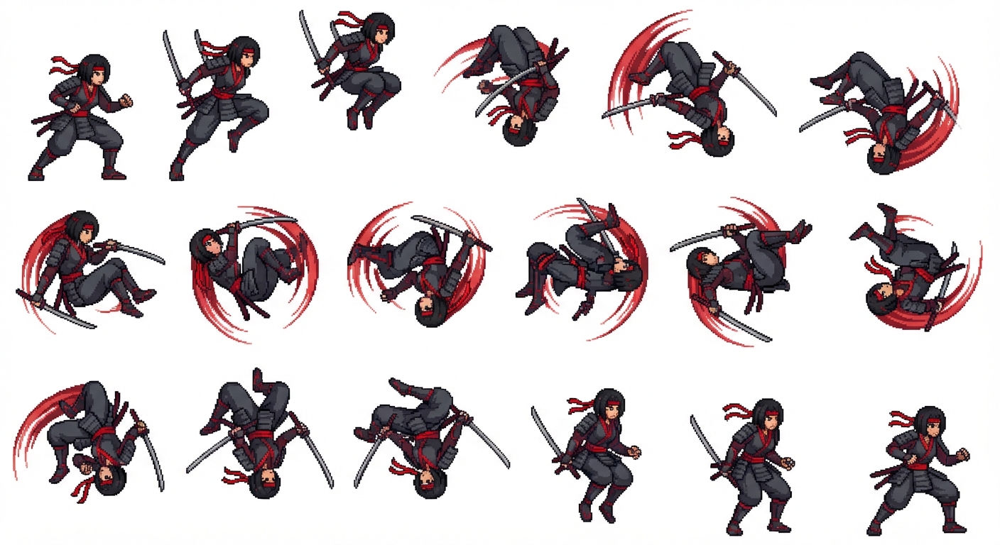 "Colorful pixel art female ronin warrior with dual katanas, samurai-inspired outfit in dark gray with vivid red accents, short black hair and red headband. Multi-frame sprite sheet animation of an extended backward flip: she pushes off the ground, rises high into the air, tucks her knees, and rotates backward through many in-air frames, forming a smooth, elegant curved motion arc. At the apex, her body is fully inverted, blades trailing with motion streaks. She continues rotating with controlled momentum before landing lightly in a combat stance. Bright, saturated pixel colors, strong contrast, clean outlines, readable silhouette at small scale. Emphasized motion trails, arc indicators, subtle afterimages, expressive cloth and scarf movement. Clear anticipation → lift-off → multiple airborne rotation frames → landing. Game-ready 2D pixel sprite sheet, fluid animation, indie action / roguelike style."