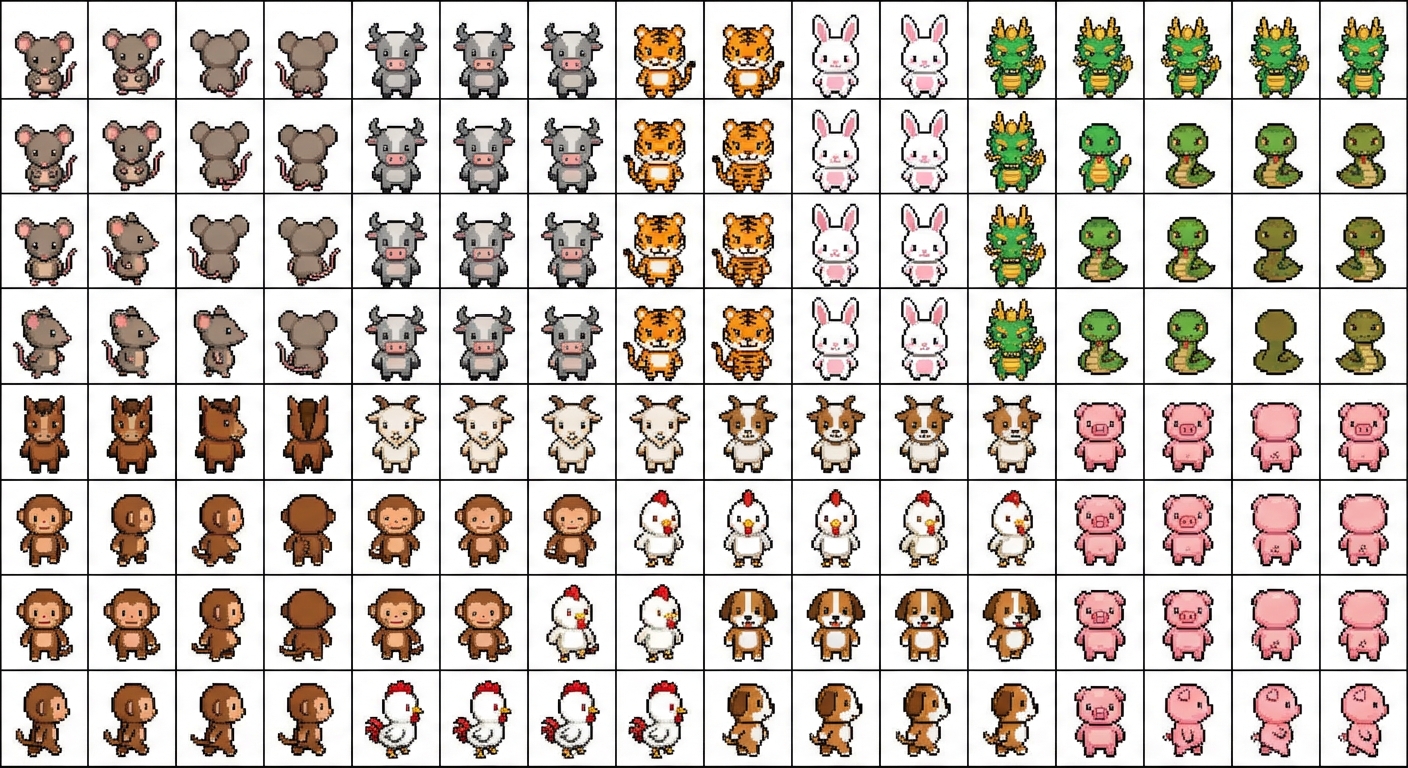 "Create a pixel art sprite sheet for a 2D top-down game: - Each frame sized 32x32 pixels - Transparent background - 12 Vietnamese zodiac animals (rat, ox, tiger, rabbit, dragon, snake, horse, goat, monkey, rooster, dog, pig) - Each animal has walking animations in 4 directions: - 4 frames walking down - 4 frames walking up - Frames arranged in rows, each row is one direction animation for one animal - Style: cute chibi, 16-bit retro pixel art - Bright colors and clean outlines suitable for GameMaker 2D top-down games - Clear grid layout for easy slicing into individual frames size 32x32 pixel!!!!!!!!!!!! "