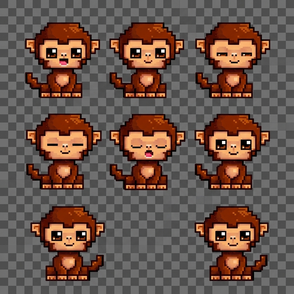 "Using the provided character as exact visual reference, create a pixel art sprite sheet for a PhaserJS-ready idle animation. The sprite sheet must be a clean grid layout, perfectly aligned, with consistent frame size. Animation: Idle – Subtle mouth movement (breathing / small mouth motion) – Tail swaying gently – Occasional eye blinking Technical requirements: – Each frame: 128x128 pixels (or closest optimal size maintaining sharp pixel clarity) – No extra padding or margins between frames – Uniform background (transparent preferred) – Pixel-perfect edges, no blur or anti-aliasing – Consistent character position across all frames (no jitter) Style: – Cute pixel art – Exact color palette and proportions matching the original character – Front-facing view The result must be a perfect idle animation sprite sheet, fully usable in PhaserJS, ready to be imported with frameWidth and frameHeight without manual correction."