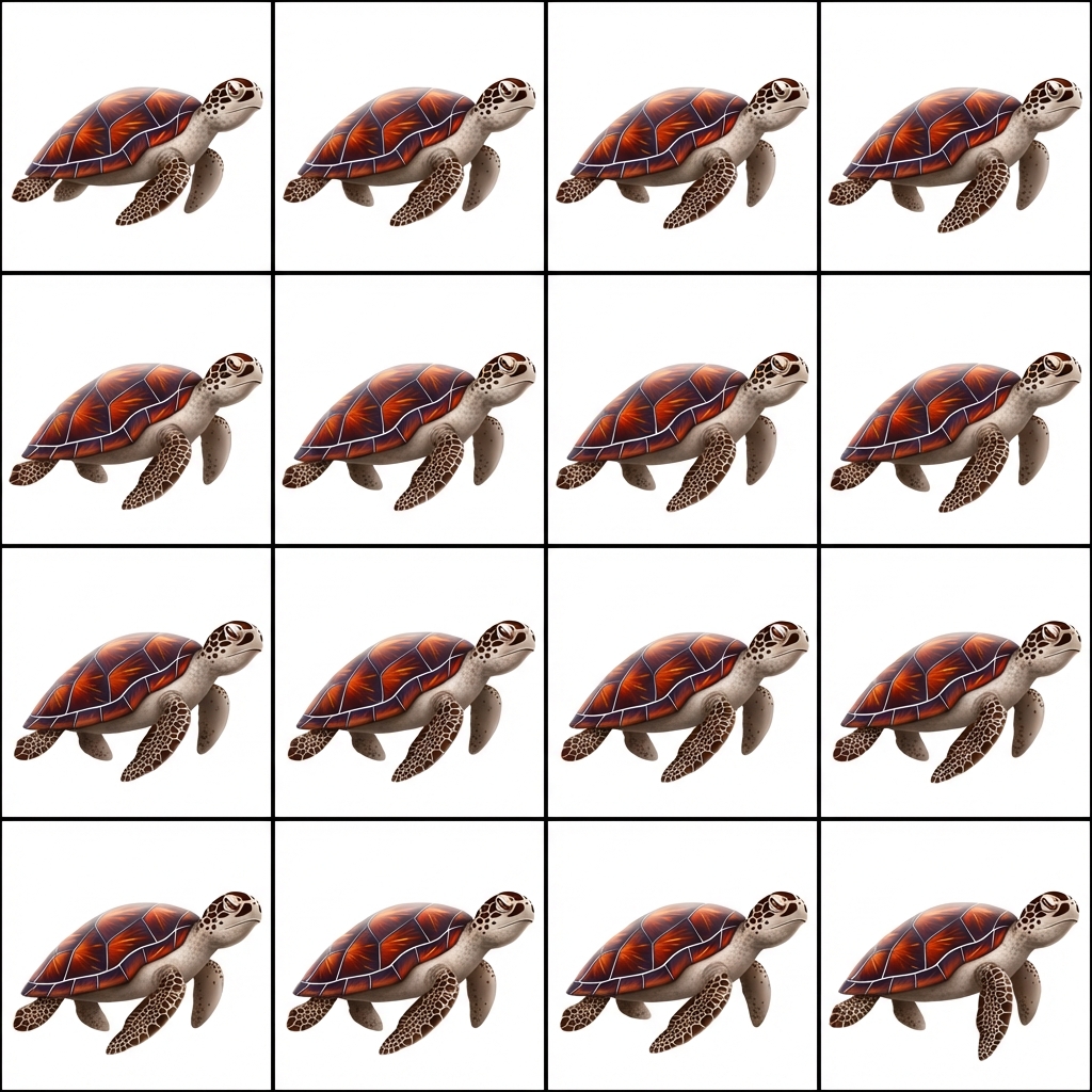 "Generate a 16-frame sprite animation of a turtle walking. Animation rules: - Fixed camera, no rotation - Same turtle identity across all frames - One leg moves at a time - Slight body sway left and right - Shell remains heavy and stable Visual rules: - Transparent or white background - Consistent lighting - Clean edges - PNG output, square aspect ratio This is for a web sprite sheet animation. "