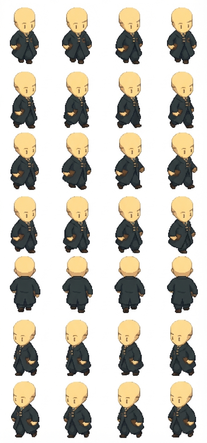 "Make a walk cycle Sprite sheet of this character going at every direction"